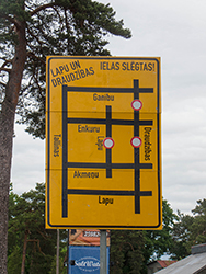 In Zvejniekciems sah ich wieder so ein Schild mit diesen Verbotsschildern drauf. Zum Glück betrafen die Sperrungen nicht meine Route.