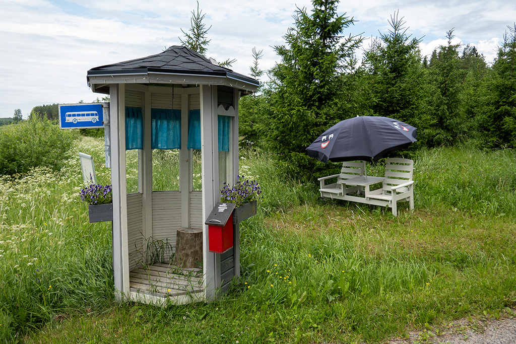 Kurz nach Hajala war ein toll gestalteter Rastplatz mir Bushaltestelle eingerichtet. War sogar ein Gästebuch ausgelegen. Mit Blick auf den Himmel und die ersten Tropfen verkniff ich es mir, hier mehr Zeit zu verlieren, als unbedingt notwendig. Ich hoffe, dass der Regen vorbeiziehen würde und so entschied ich mich, mich hier nicht unterzustellen, sondern weiter zu fahren.