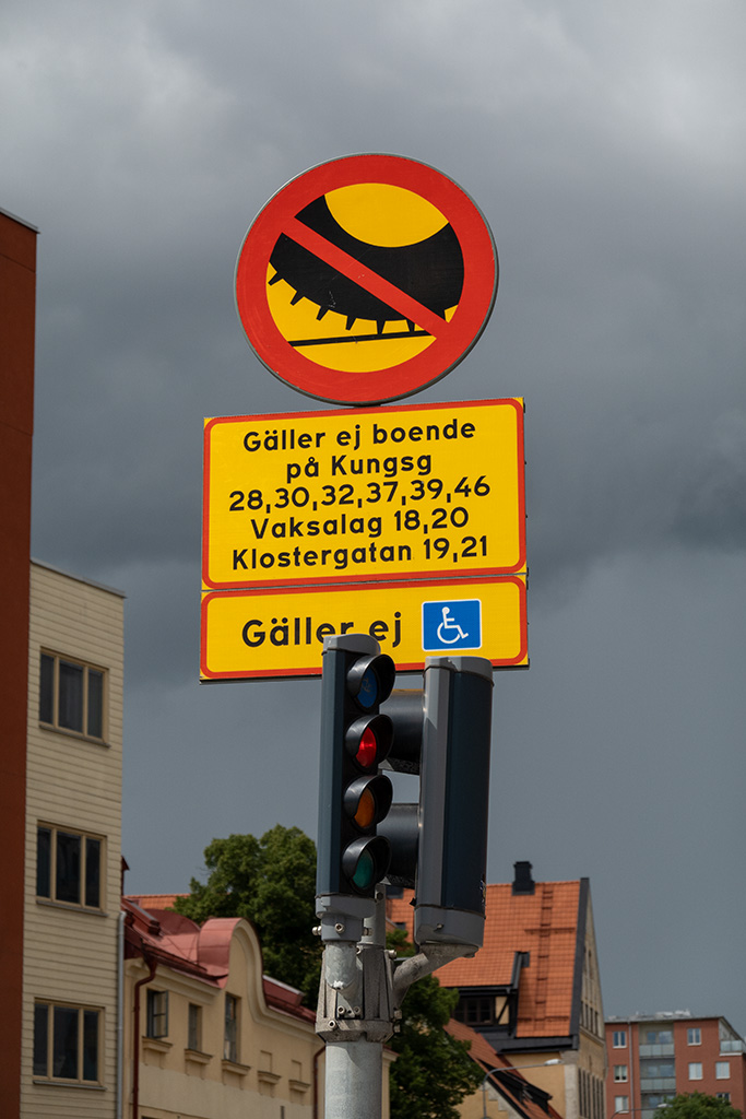 Hier gab es interessante Straßenschilder. Spike-Reifen sind hier noch weit verbreitet, auch im Sommer fahren immer wieder Fahrzeuge mit Spikes rum (sind schon von weitem zu hören).
