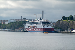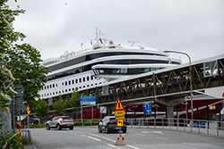 Es ging entlang des Hafens, über die Slussbron zur Skeppsbro Bakery. Dort musste ich noch kurz warten, bis sie öffneten und ich, mit Blick auf die Fähre, frühstücken konnte. Bei der Gelegenheit justierte ich den Lenker am Fahrrad nach, damit ich angenehmer greifen konnte.