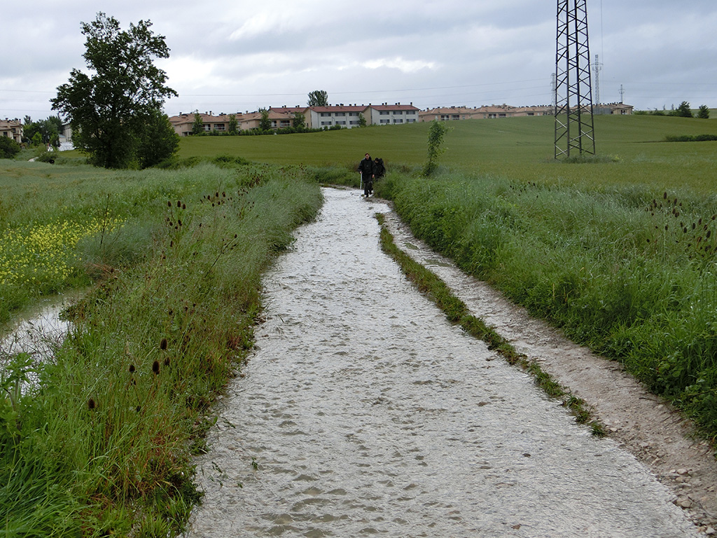 Weiter ging es dann auf der Straße (der Reiseführer, sowie ein Einheimischer oben auf dem Pass warnten explizit vor der Abfahrt über den Fußweg). Bei Munzabei habe ich dann noch einen kleinen Abstecher zur "Eremita de Nuestra Semora de Eunate" gemacht und die achteckige Kirche bewundert. Dann habe ich eine Einheimische nach dem Weg Richtung Obanos gefragt, aber irgendwie gab es wohl Kommunikationsschwierigkeiten: Sie schickte mich in die falsche Richtung. Irgendwann bin ich dann doch wieder auf den rechten Weg gekommen und einige Zeit später in Puente la Reina angekommen, wo ich mich erstmal mit frischen Baguette und Wurst eingedeckt und eine ordentliche Brotzeit gemacht habe. Die Brücke in Puente la Reina ist schon faszinierend, auch wenn ich nur den oberen Teil sehen konnte, da auch hier Hochwasser war. Anschließend dann völlig unspektakulär auf der N-111 nach Estella, meinem ersten Ziel, gefahren.