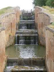Anschließend ging's beschaulich, aber eigentlich unspektakulär, teilweise auf Schotterpisten oder am Kanal entlang weiter bis nach Frómista. Hier war dann der Kanal mit seinen Stufen zu bewundern. Auf diesem Weg sah ich auch eine Pilgerin mit ihrem Esel. Sie war von Frankreich her unterwegs auf dem Weg nach Santiago de Compostela.