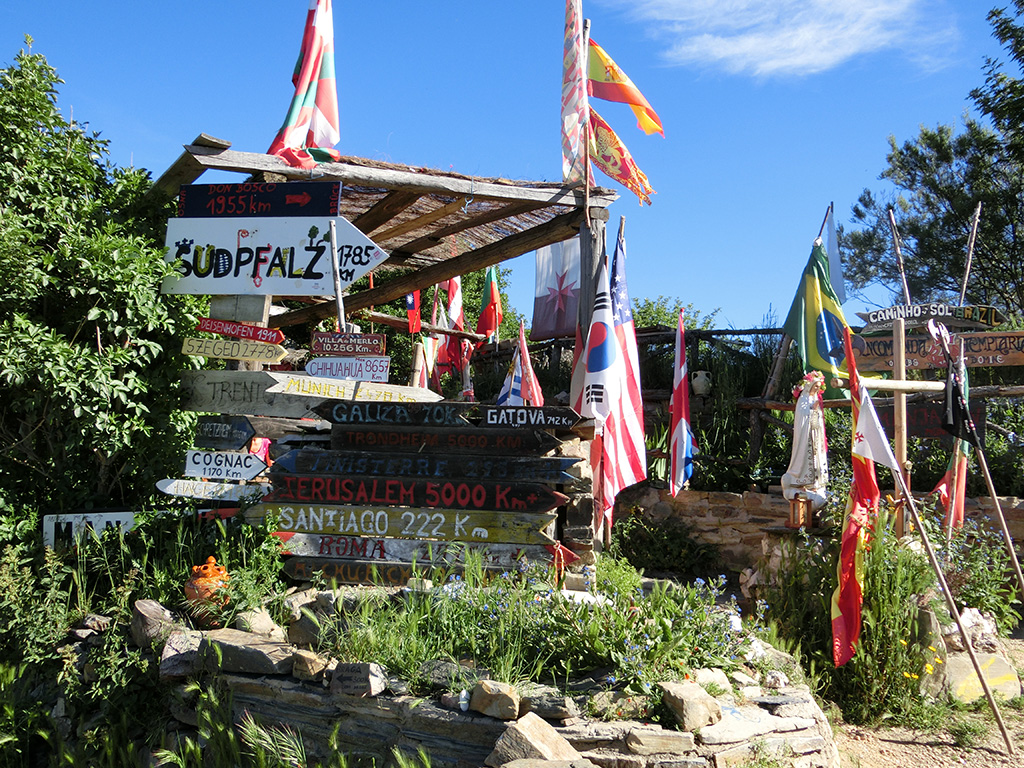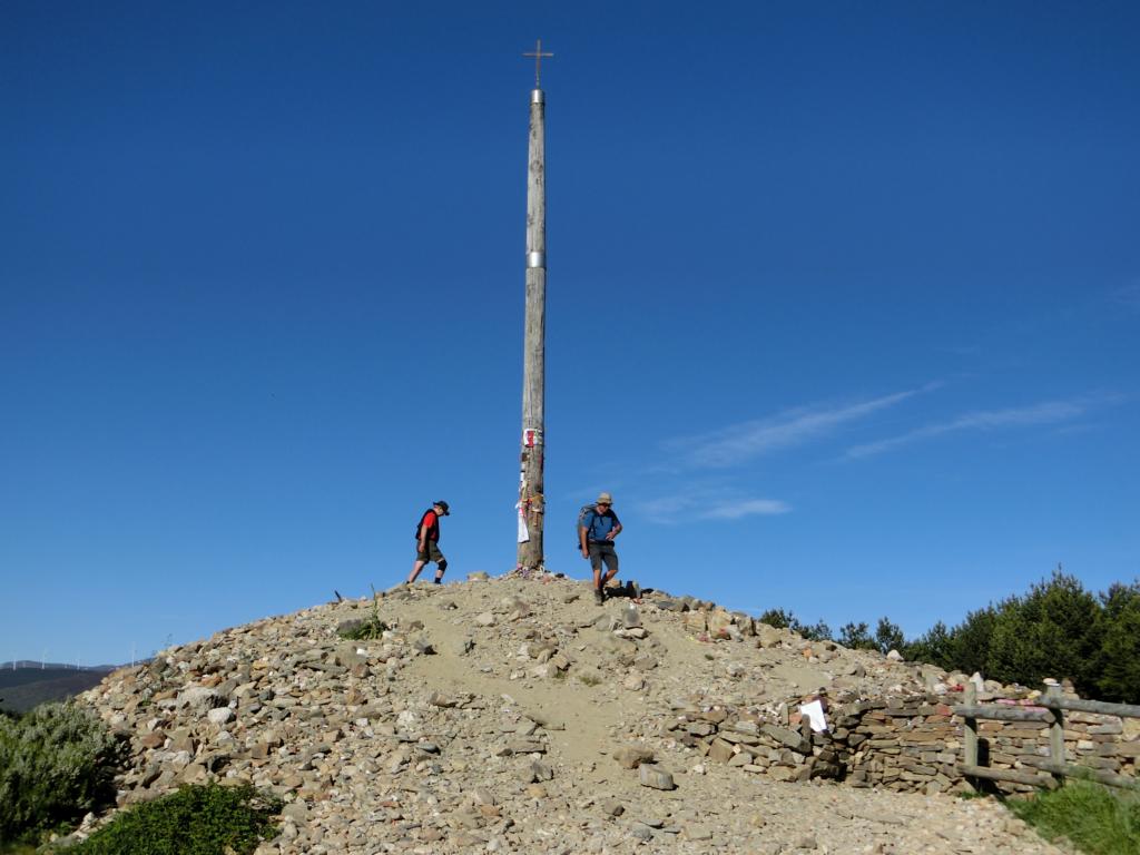 Anschließend ging es mit leichtem Auf und Ab zu einem der Höhepunkte der Reise, zum "Cruz de Ferro". Auf dem Weg dahin traf ich Rutger wieder, der genau in dem Moment die Straße querte, in dem ich auch dort vorbei kam. Irgendwie habe ich mir das "Cruz de Ferro" anders vorgestellt, aber es war trotz allem faszinierend. Natürlich hatte ich auch einen Stein von zuhause mitgenommen und am Fuße des Kreuzes abgelegt. Man sagt ja, dass man den Stein stellvertretend für die Dinge dort ablegt, die einem belasten.