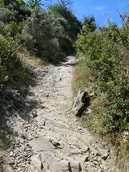 Kurz vor Riego de Ambrós war mir das Sträßchen dann doch zu langweilig und ich bog, entgegen der Empfehlung des Reiseführers, doch auf den Fußweg ab. Um diese Zeit waren wenig Fußgänger auf diesem Streckenabschnitt unterwegs und mit den Fußgängern, die ich angetroffen habe, konnte man sich immer gut arrangieren. Und der Weg hat mir dann so richtig Spaß gemacht. Schnell fahren konnte ich zwar nicht, aber das war auch nicht nötig, so konnte ich den Spaß länger genießen. Bis auf das kleine Ungemach, was auf dem Weg passiert ist. Plötzlich war mein Gesäß nass. Erst fragte ich mich, wie das sein konnte, doch dann wurde es mir schnell klar. Meine Wasserblase im Rucksack hat der Belastung nicht Stand gehalten und ist an der Naht aufgerissen. Das ganze Wasser ist dann eben über mein Gesäß geflossen. Klasse. Hose nass, Rucksack nass. Wobei ich Glück hatte: Mein Rucksack hat ein extra Fach für die Wasserblase und von daher war nur ein kleines Stück am Rucksackboden nass, die Klamotten und der ganze Rest war trocken geblieben. Und bei den herrschenden Temperaturen war auch die Hose bald wieder trocken.