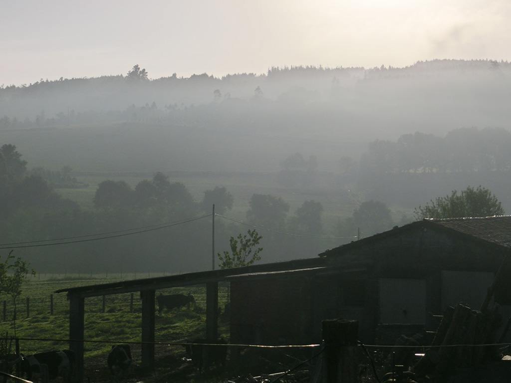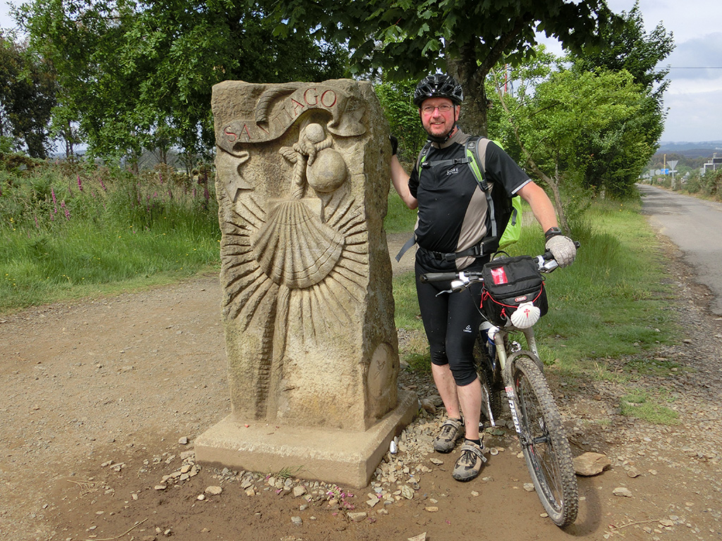 Irgendwann bin ich dann auch los gefahren, Slalom durch die Pilger, die zu Fuß unterwegs waren. Zuerst ging es natürlich erstmal bergauf, was sonst. Nach kurzer Fahrt habe ich Christine wieder getroffen. Noch ein kurzer Ratsch und dann ging's weiter. Wir wollten uns ja eh am nächsten Tag vor der Kathedrale wieder treffen. Etwas weiter habe ich dann den Kölner wieder getroffen. Auch wir haben uns noch eine ganz Weile gemeinsam dahin wandernd unterhalten, bevor ich weiter geradelt bin. Kurz vor einer Bar traf ich dann auf Rosemay und Tanner. Die Bar im Blick war klar, dass wir ein 2. Frühstück brauchten und so machten wir Rast und plauderten noch eine Weile. Irgendwann musste ich zwangsläufig durch Arzúa. Irgendwie sind die Städte immer etwas nicht ganz so schön zu durchfahren. Durch die Natur, ohne Autoverkehr ist es einfach schöner. Am Ortsausgang habe ich dann nochmal kurz eine Pause gemacht.