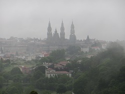 Auf den vielbeschriebenen fantastischen Blick zurück auf Santiago und die Kathedrale musste ich leider verzichten, da das Wetter einfach nicht mitspielte. Zumindest gesehen habe ich die Kathedrale, wenn auch im Dunst und Regen. Beim Frühstücken in Carballal traf ich auf zwei Stuttgarter, die von Saint-Jean-Pied-de-Port aufgebrochen waren und so wie viele Fußpilger über die Pyrenäen gelaufen sind. Sie hatten noch etwas länger zu laufen, um zum Cap Finisterre, dem Ende der Welt zu kommen. Guten Mutes starteten wir nach dem Frühstück auf den weiteren Weg.