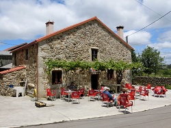 Ich erreichte also die Herberge "Casa Pepa", wo ich mir vorab ein Bett reserviert hatte. Ich duschte und richtete mein Bett her, bevor ich mich draußen in die Sonne setzen und ein Bier genießen wollte. Als ich mit meinem Glas ins Freie trat, saß da die Südtirolerin und genoss ein Glas Wein. Wir plauderten eine ganze Weile, bevor sie aufbrach. Sie wollte noch nach Ponte Olveira oder nach Olveira laufen und das waren immerhin so runde 10-12km und es war schon 16 Uhr. Aber die Dame machte einen durchtrainierten Eindruck. Ich schaute mir noch die kleine Kirche gegenüber an und verbrachte dann den Abend bei einem Pilgermenü in der Herberge. Alternativen hatte man in diesem Ort eh keine.