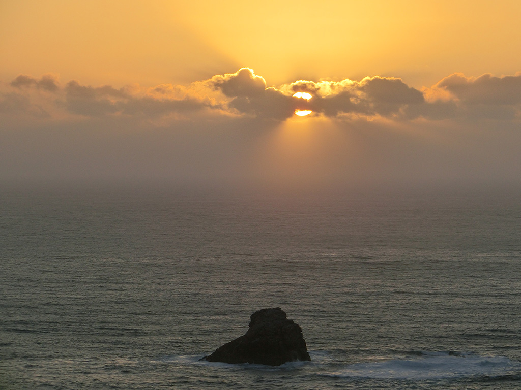 Ich war dann so gegen 16 Uhr wieder in der Herberge zurück. Vor der Herberge stand das Handbike von Pietro, er war also auch an seinem Ziel angekommen. Ich duschte und ging erst einmal mit Christoph, einen Mitpilger, der auch in der Herberge übernachtete, ein Bier trinken. Nach dem Essen gingen wir gemeinsam mit einem anderen Pilger zu Fuß zum Kap Finisterre, um den Sonnenuntergang zu bewundern. Irgendwie verloren wir uns aus den Augen und so saß ich auf einem Stein und betrachtete den Sonnenuntergang. Die anderen beiden saßen, wie ich später erfahren habe, nur wenige Meter entfernt in der Bar bei einem Glas Rotwein. Es war richtig schön dort oben.