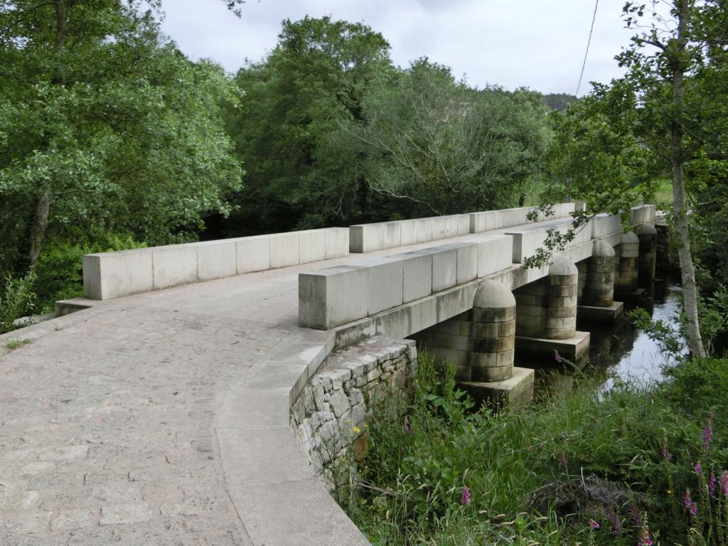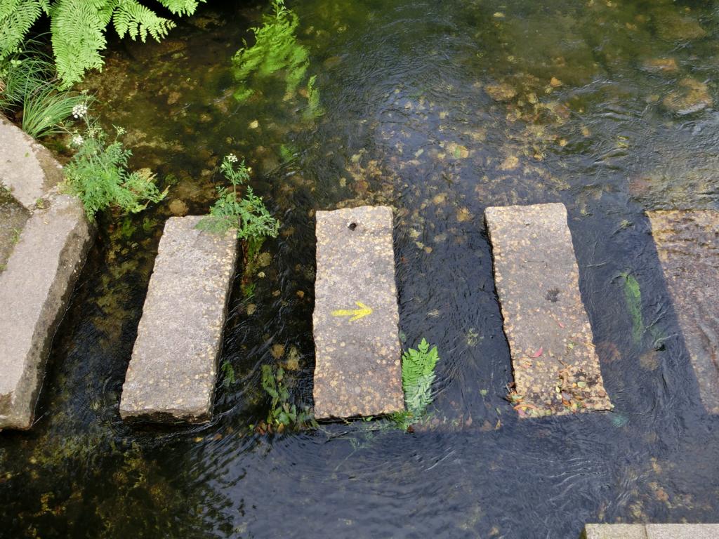 Dann kam ich an die bekannte Stelle, bei der ein Bach überquert werden musste. Seit 2012 gibt es hier eine Brücke, die speziell für die Pilger erbaut wurde. Vorher musste man den Bach über Steinquader queren, was wohl etliche Pilger zur Umkehr bewogen hatte. Auf einem der Steinquader sieht man noch die Wegmarkierung, den gelben Pfeil. Anschließend ging es gefühlte Ewigkeiten (ca. 8km) bergauf, bis zum höchsten Punkte der heutigen Etappe, auf 280m. Nach der anschließenden Abfahrt erreichte ich Muxía, das Ende meiner Pilgerreise.