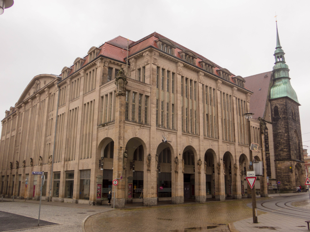 Direkt gegenüber, durch den Marienplatz getrennte liegt das "Kaufhaus Görlitz". Das (nach eigenen Angaben) "schönste Kaufhaus Deutschlands" wurde 1913 erbaut und wurde dem Kaufhaus Wertheim am Leipziger Platz in Berlin nachempfunden. Vielleicht hätte ich doch mal rein gehen sollen, auch wenn ich Kaufhäuser nicht so mag.