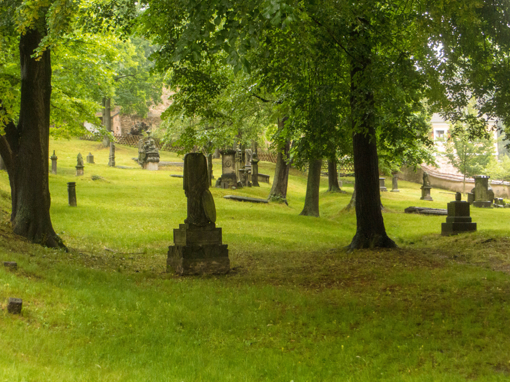 Neben den "normalen" Gräbern gibt es hier auch noch 17 erhaltene Grufthäuser. So z.B. die Fröhlichgruft (links) und die Tobiasgruft (rechts hinten).