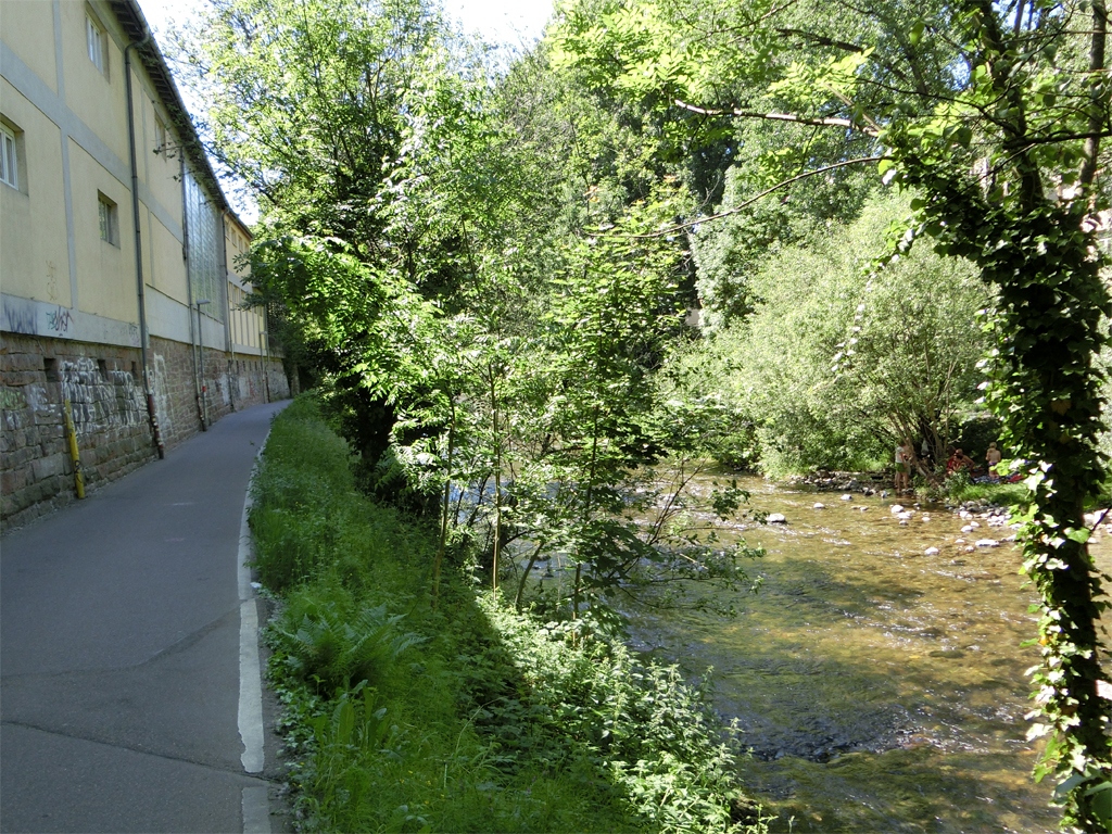 Vorbei ging's am Strandbad und dem Schwarzwald-Stadion des SC Freiburg auf den Radweg an der Dreisam entlang. In der Stadt wurde es dann noch unerträglicher. Es war unglaublich heiß. An der Baustelle der Kronenbrücke fuhr ich Richtung St. Georgen.
