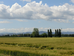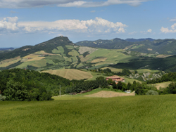 Um 9:30 Uhr morgens schon 26°C und wolkenloser Himmel. Endlich ein Wetter, bei dem es richtig Spaß macht zu radeln. Die Po-Ebene selbst ist jedoch etwas langweilig. Reine Agrarindustrie-Fläche, keine Abwechslung, soweit das Auge reicht. Die höchsten Erhebungen sind die Brücken über die Autobahnen und die Eisenbahnstrecken. Irgendwann tauchten sie dann auf, die Berge des Apennin.