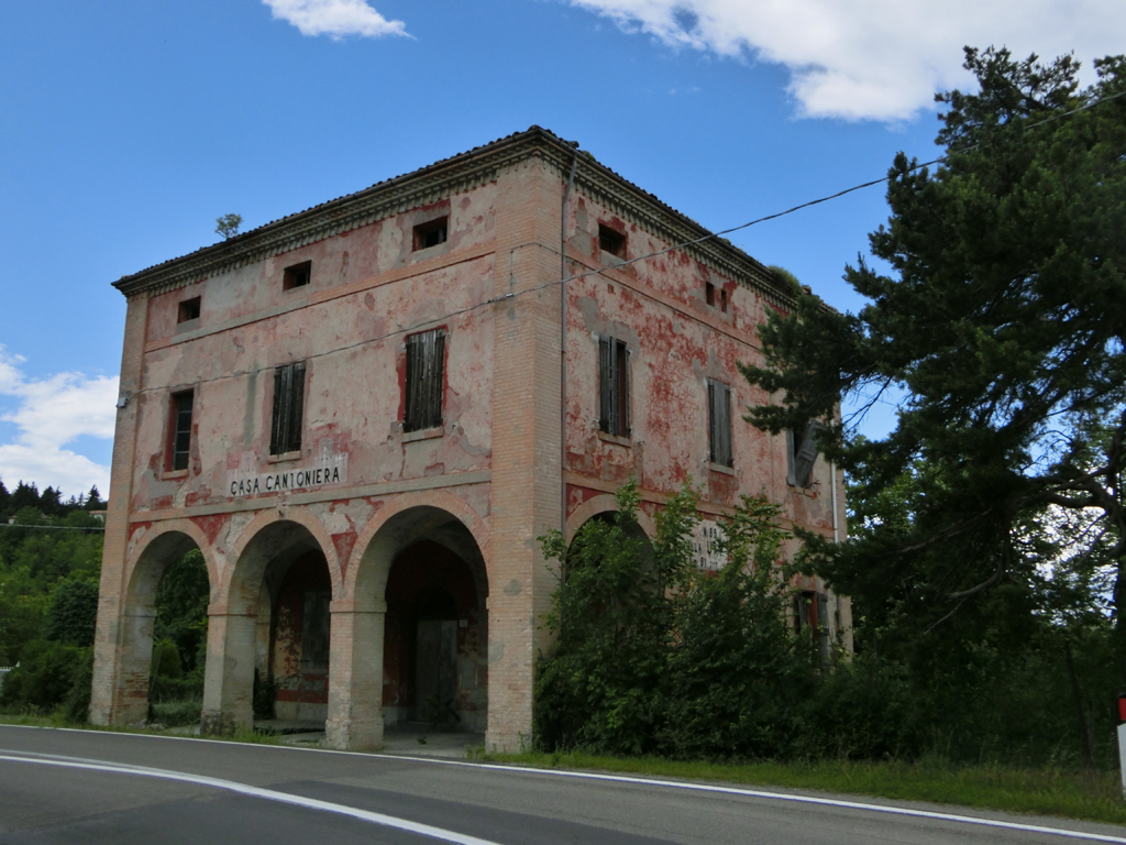 Ein Stück weiter war wieder eines dieser verlassenen Gebäude zu sehen, die an vergangene Zeiten der Strada Statale 65 erinnern. Das Bild hätte ich beinahe bitter bereut. Dass die italienischen Auto-/LKW-und Busfahrer nicht unbedingt rücksichtsvoll mit Radfahrern umgehen, daran hatte ich mich ja seit dem Wegfall der Radwege am Gardasee gewöhnt. Aber dass der Busfahrer hier nur Zentimeter an meinem Fahrrad vorbei fuhr, das außerhalb der eigentlichen Fahrbahn an einer Böschung lehnte und mich dabei auch noch fast mitnahm, hatte schon einen besonderen Touch.