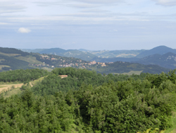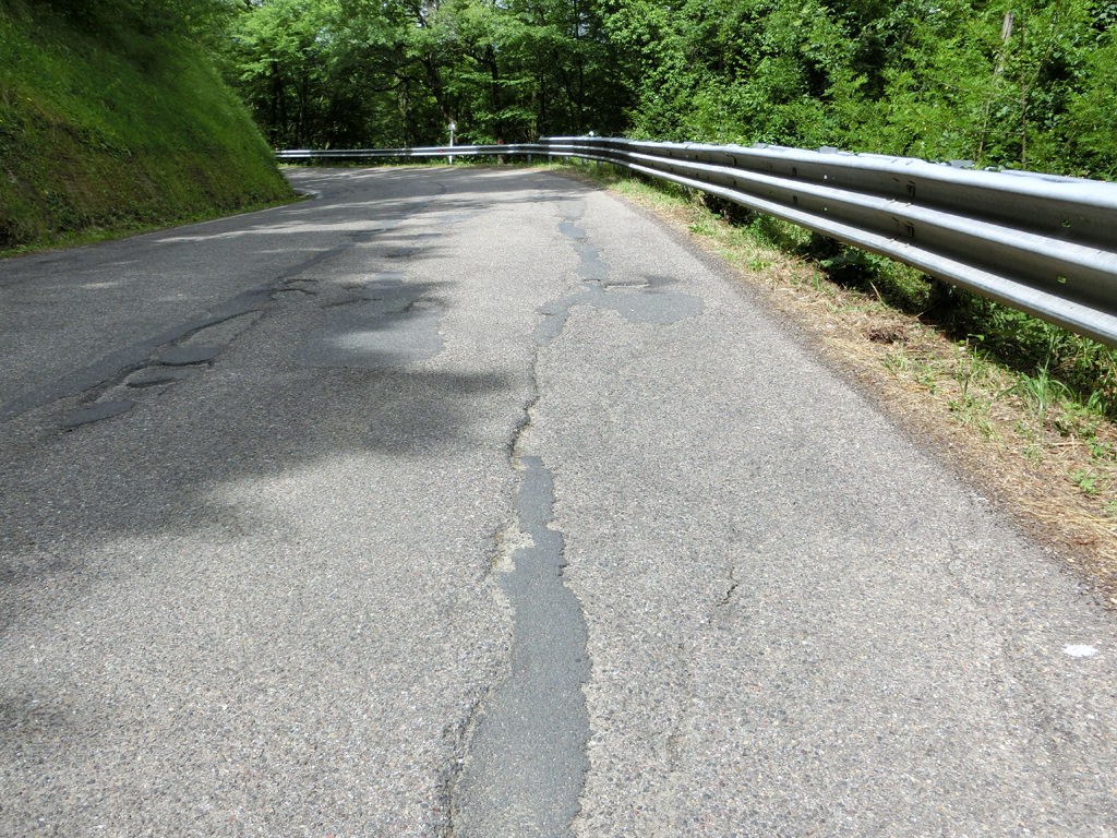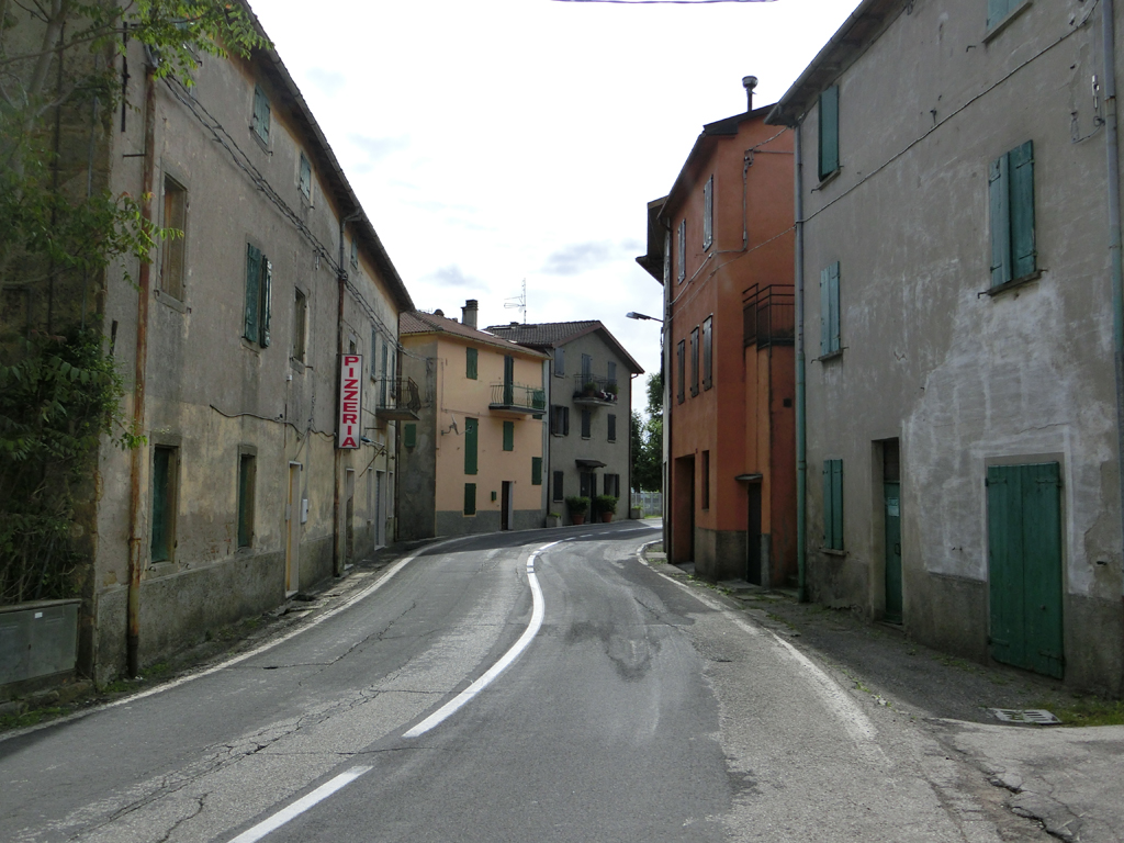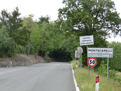 Ab hier ging es stetig bergab. Mir kamen einige Radler entgegen, die sich der Berg hochquälten. Ich dachte ja, dass ich die Steigungen für heute hier schon hinter mir hatte, aber weit gefehlt. Kurz vor Montecarelli verließ ich die Hauptstraße und bog auf eine kleine Nebenstraße ab. Die Straße wurde, zunehmend schlechter, dafür war aber kaum Verkehr. Aber die Schläge, die durch die hart aufgepumpten Reifen übertragen wurden, waren schon ganz schön heftig. Ich hoffte nur, dass das Fahrrad nicht schlapp machte.