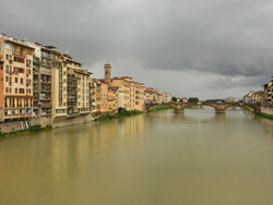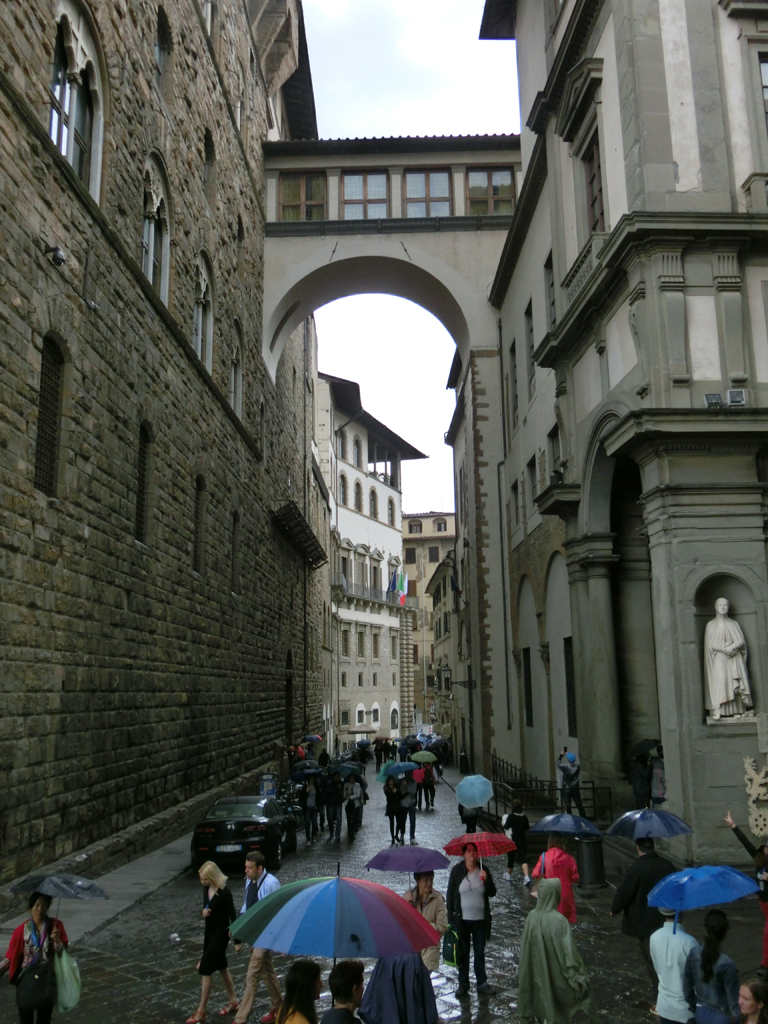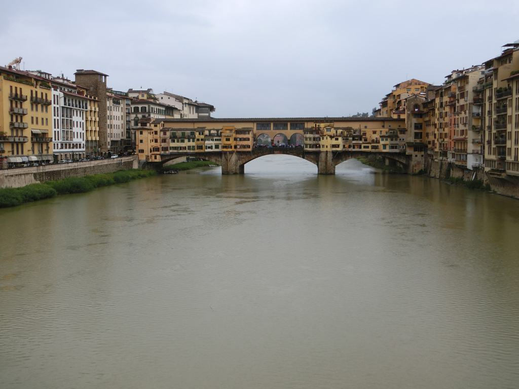 Also ging ich weiter zur Ponte Vecchio. Nicht nur die Brücke ist sehenswert, sondern auch die Blicke entlang des Arno. Und außerdem ist genau auf der Brücke ein Geocache versteckt. Gerade also ich die Brücke betrat, begann es wie aus Kübeln zu schütten.
