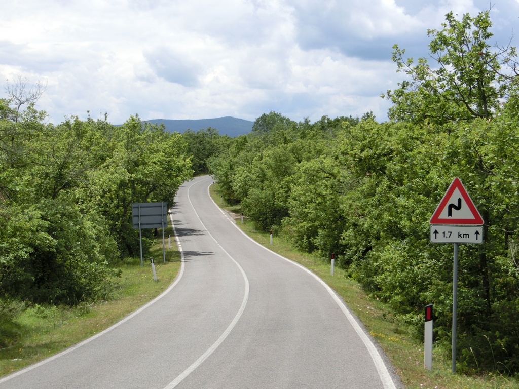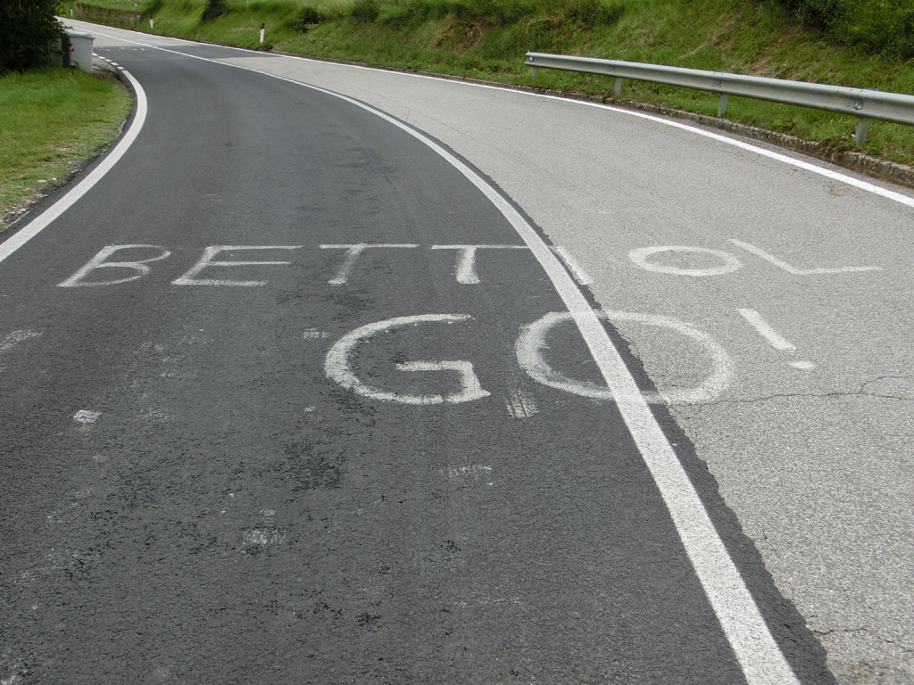 Scheinbar führt über dieses Sträßchen ein Radrennen nach oben. Aber für mich ging es in flotter Fahrt bergab, wohlwissentlich, dass ich jeden Höhenmeter, den ich herunter fuhr, mir anschließend wieder den Schweiß auf die Stirn treiben sollte.