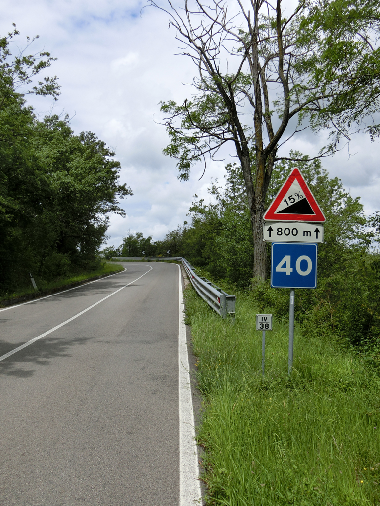 Aber was war das? Kurz vor dem Erreichen des letzten "Höhepunktes" des Tages, dem Städtchen Castellina di Chianti, tauchte doch völlig unvermittelt ein Schild auf, welches für die nächsten 800m eine Steigung von 15% versprach. Half ja nichts, da musste ich rauf, weil schieben kam so gar nicht in Frage.