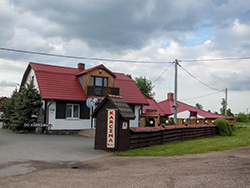 Ca. 100m vor meinem heutigen Zeil, dem Hotel Karczma Pod Topolami war die Straße nass. Zum Glück hatte ich an der Tankstelle noch was gegessen, sonst wäre ich auf den letzten Metern noch nass geworden.