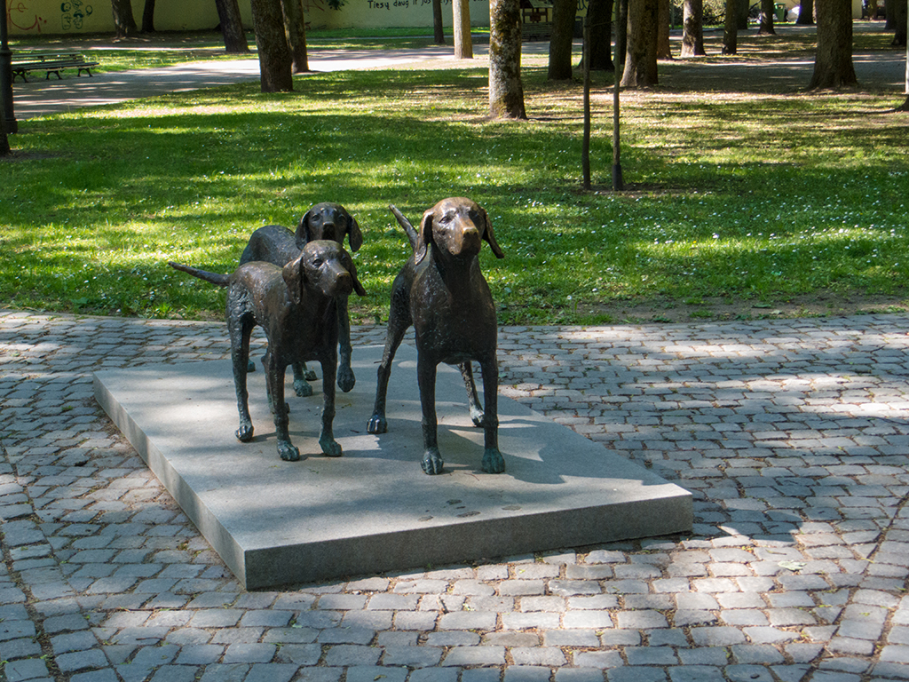 Wieder unten ging ich durch den angrenzenden Park. Dort war doch echt eine Statue mit 3 Hunden aufgestellt. Ich war froh, wenn ich auf dem Fahrrad keine Hunde sehe, da die einem meist bellend jagten. Wie auch immer, ich ging weiter zur Kathedrale...