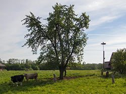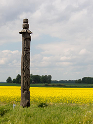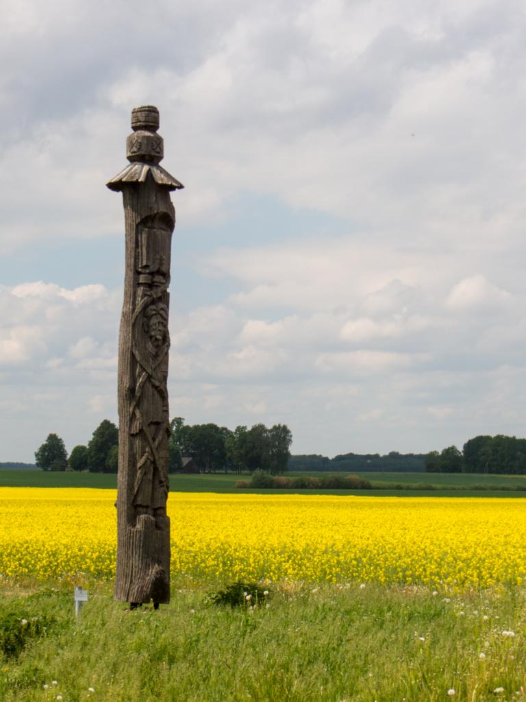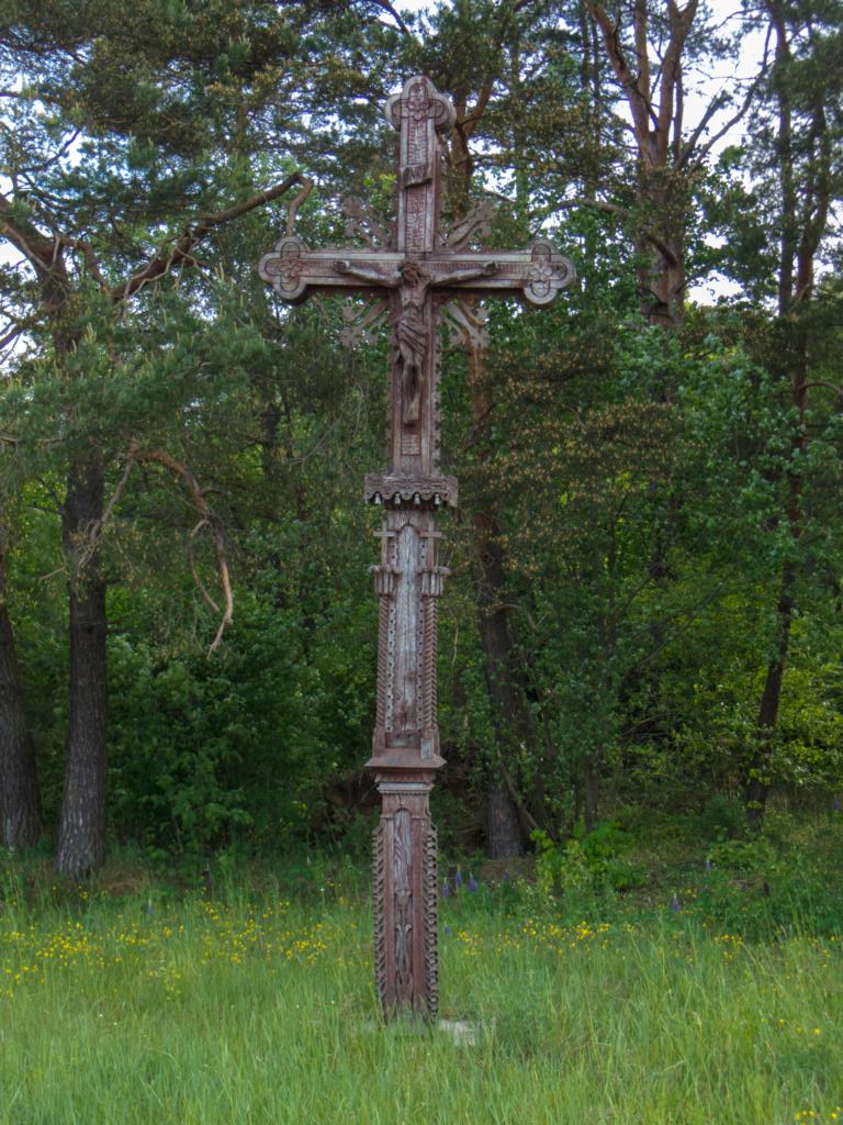 Etwas später, bei Mieliunai kam ich wieder an einem dieser Kreuze am Straßenrand vorbei, so dachte ich zumindest. Es stellte sich als ein Art Totem dar, aber mit christlichem Hintergrund. Schön, aber etwas seltsam und außergewöhnlich.