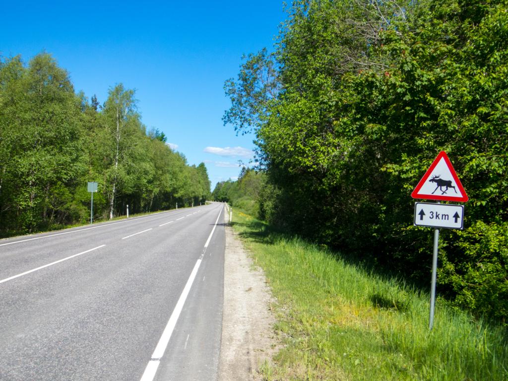 Später bog ich dann links auf die Straße Nr. 15 ein, eine recht gut ausgebaute Straße Richtung Tallinn ein. Natürlich bedeutete dies wie der mehr Verkehr. Hier in Estland haben sie wohl keine fröhlich tanzende Hirsche, sondern eher phlegmatische Elche, zumindest wenn man den Straßenschildern trauen darf. Straßenschilder zeigen hier eh manchmal eine verkehrte Welt. Auf meiner ganzen Fahrt durch Estland habe ich keine Frau gesehen, die noch im Stil der 1950/60 Jahre gestylt war, außer auf Verkehrsschildern.