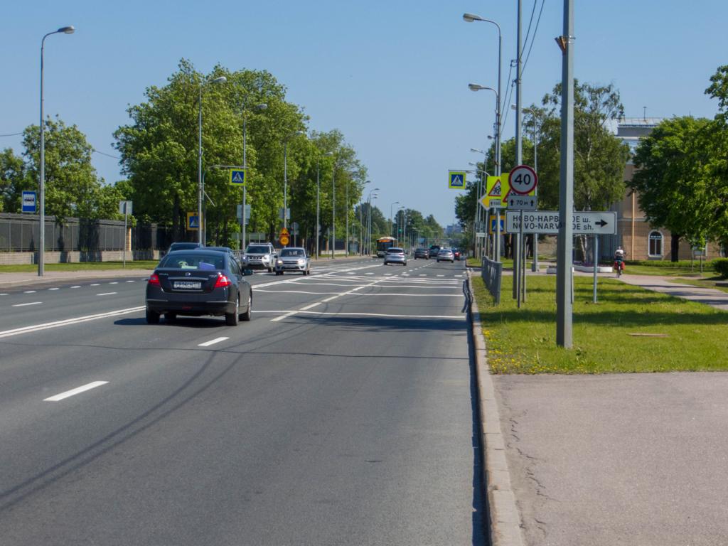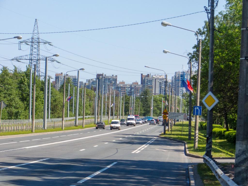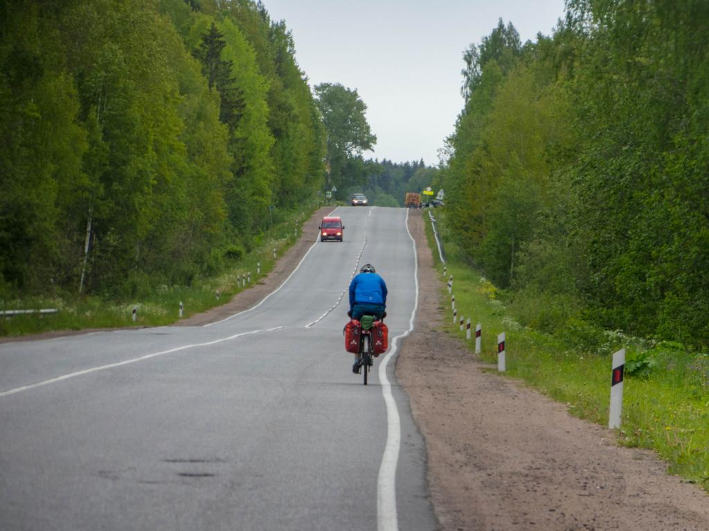 Die Straße wurde breiter, aber eigentlich gut befahrbar. Ab und an konnte man mal auf einen Fuß oder Radweg ausweichen, aber ansonsten bleib halt nur diese Straße, die hier noch nicht ganz so stark befahren war. Ein Vorgeschmack auf den Verkehr St. Petersburg selbst.
