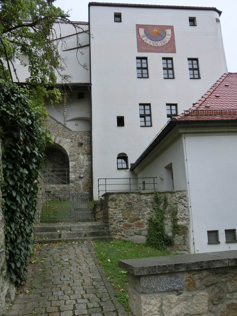Um 15:30 Uhr erreichte ich die Jugendherberge auf der Veste Oberhaus. Da die Rezeption erst ab 16 Uhr besetzt war, blieb noch Zeit für einen Schokoriegel und eine Cola aus dem Automaten. Da die nette Dame von der Rezeption schon etwas früher kam, hielt sich meine Wartezeit in Grenzen. Während der Rechner hochfuhr, konnte ich mein Rad schon einmal in den Schuppen stellen. Natürlich nicht ohne einen "Das Fahrrad sieht ja für ein Rennrad ganz schön dreckig aus"-Kommentar abzubekommen. Ich muss aber sagen, sie hatte vollkommen recht. Nachdem ich eingecheckt hatte, seilte die Dame mir auch noch mit, dass die Polizei im Hause wäre. Nämlich mit 108 Personen, da derzeit sehr viele Beamte der Bundespolizei wegen der Flüchtlinge am Bahnhof eingesetzt wären. Also sicher wohnt man hier schon mal. Das 8-Bett-Zimmer lag in einem Nebentrakt, im mittleren Stock unter der Sonnenuhr.