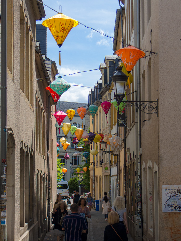 In der Rue du St. Esprit hängen in Luxemburg anstatt der üblichen Regenschirme Lampions über der Straße.