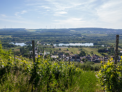 Etwas weiter erreichte ich dann die Weinberge oberhalb von Remerschen. Ein traumhafter Blick von hier oben auf die Mosel und die Landschaft. Aber erste einmal ging es 160Hm hinunter zur Mosel (und danach natürlich wieder bergauf). Ich weiß, warum Weinberge zur radeln nicht die beste Wahl ist. Es ist immer steil, in diesem Fall bergab. Also musste ich häufig bremsen, was die Bremsen mit zunehmender Bremsdauer und damit zunehmender Hitze mit immer lauterem Quietschen quittierten. Die Lautstärke wuchs gefühlt auf die eines bremsenden Güterzugs an und ich war froh, als ich die Mosel erreichte. Zum Glück fand ich gleich eine Tankstelle, an der ich mich verpflegen konnte, während meine Bremsen langsam wieder auf Normaltemperatur abkühlen konnten. Lustig war es hier, obwohl ich mich in Luxemburg befand (die Spritpreise wären für Deutschland völlig utopisch niedrig), sprachen alle Deutsch mit saarländischem Dialekt.