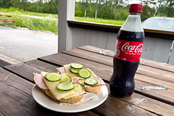 Irgendwie sah hier alles so leer aus. Kein Auto auf dem Parkplatz und auch sonst wie tot. Aber die Lichterkette brannte, das gab Hoffnung. Bei der Bestellung war ich natürlich überfordert, da alles auf einer riesigen Tafel über dem Bestellfenster stand. Uns so einigte ich mich mit der Wirtin auf ein Schinken-Käse-Sandwich und eine kalte Cola. Tat das gut...