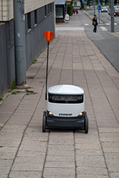 Ich hatte zwar davon gehört, aber gesehen hatte ich so ein "Starship" noch nicht. Der kleine Freund fährt autonom auf dem Gehweg und liefert weiß der Geier was. Der kleine Freund hat sogar angehalten, als ich für das Foto in seiner Fahrstrecke stand. Ich war stolz auf den Kleinen, dass er mich nicht einfach über den Haufen gefahren hat.