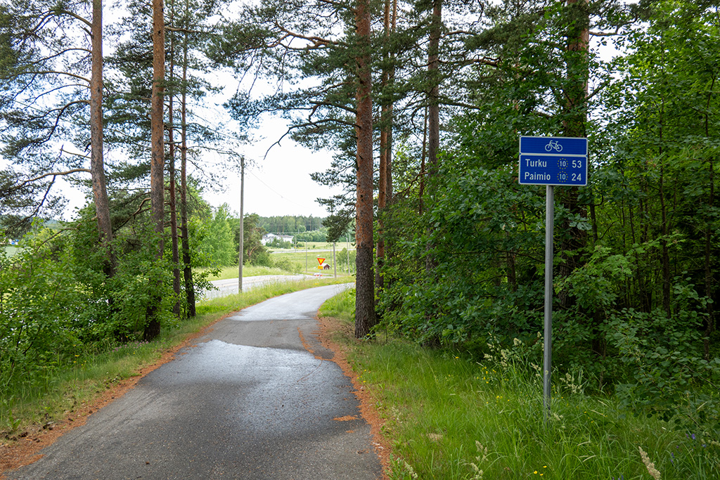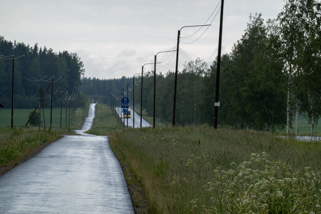 Am Ortseingang von Paimio begann es dann deutlicher zu tröpfeln. Die Tropfen wurden immer größer und mehr. Ich beschleunigte also, um irgendwo ein sicheres und trockenes Plätzchen zu finden. Optimal wäre jetzt ein Café gewesen, aber es war nichts in Sicht. Und je länger ich fuhr, desto nasser wurde es.