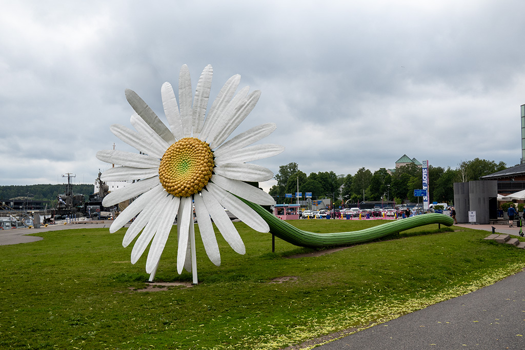 Erstmal fuhr ich aber in Richtung des Fährterminals, damit ich wusste wo ich nachher hin musste, um die benötigte Zeit besser abschätzen zu können. Auf dem Weg dorthin konnte ich auch noch das Kunstwerk einer überdimensionalen Blume bewundern. Sa schön aus, der Uferbereich um den Fluss Aurajoki.