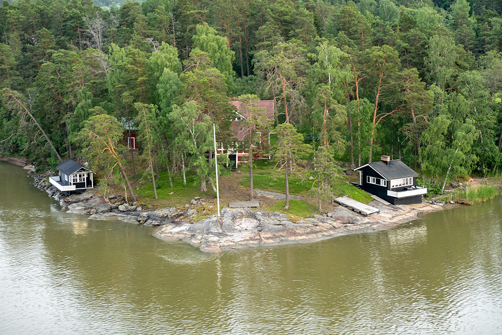 Der Ausblick von Deck war phänomenal. Der schmale Fahrweg zwischen den Inseln hindurch und immer wieder Häuser mit Anlegestellen und, ganz wichtig, einem Fahnenmast daneben.