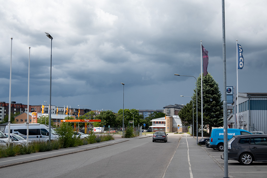 An der Kreuzung Rabyvägen/Svartbäksgatan begann es zu regnen. einige große Tropfen, bevor sich die Schleußen öffneten. ich schaffte es gerade noch unter ein Dach einer Ausfahrt, um nicht nass zu werden.