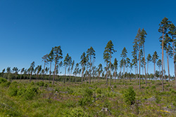 So ging es auf ruhigen Sträßchen durch die Landschaft. Ab und an tauchten auch mal gerodete Flächen auf, auf denen noch einige hohe Bäume standen. Die schwedische Art, wieder aufzuforsten. Mal haut alle Bäume weg und lässt einige Samenbäume stehen. Den Rest erledigt die Natur. OK, die Baume stehen dann nicht so schön in Reih und Glied, wie es ein Deutschland der Fall wäre, aber ein sehr effiziente Methode.