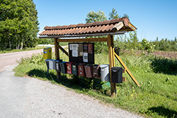 Zwischendurch mal wieder ein Dorf-Informationszentrum am Straßenrand: Briefkästen (Empfang und Versand) und ein Anschlagsbrett mit allerlei Aushängen.