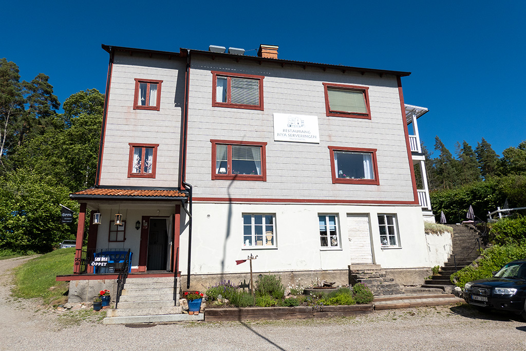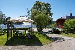 Nya Serveringen. Hier war es traumhaft zu sitzen, unter dem Pavillon mit Blick zum See. Das Sandwich war einfach, aber gut und die kalte Cola schmeckte eh nach der anstrengenden Etappe. Danach noch einen Kaffee und ich war ganz der Alte. Der Wirt war voll nett, er bot mir sogar an, meine Wasserflachsen mit frischen Leitungswasser zu füllen. Ich lehnte dankend ab, da ich nur noch ca. 700m zu fahren hatte.