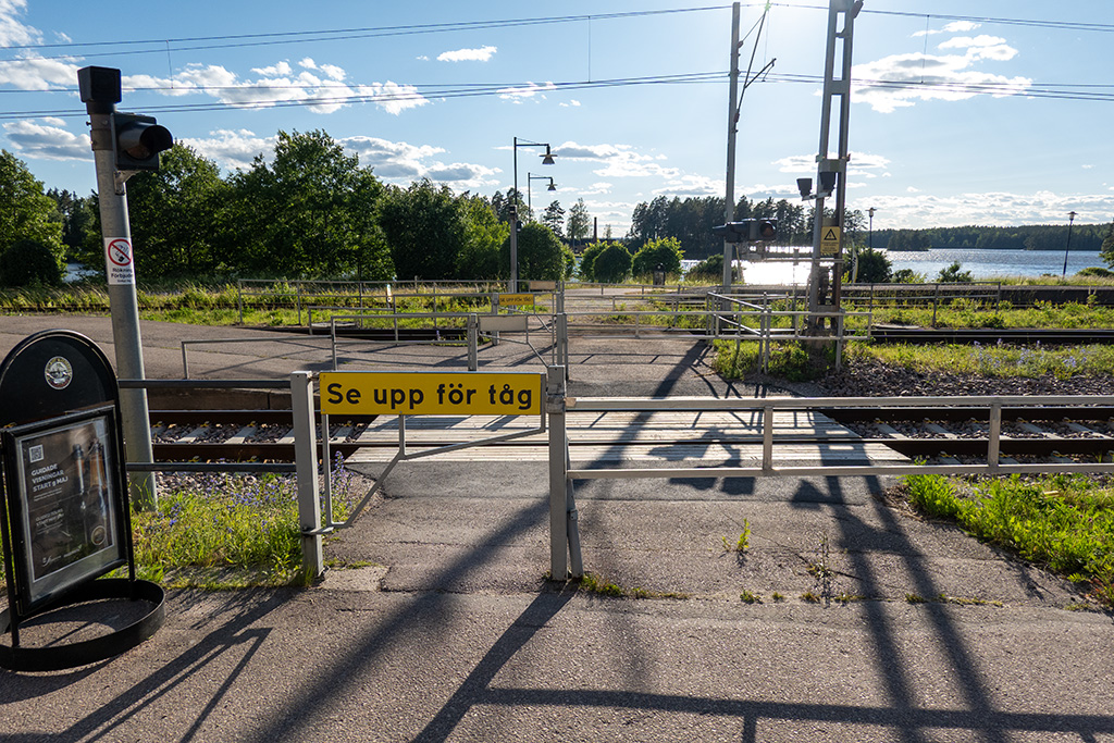 Obwohl in Ängelsberg nur 90 Menschen leben (Stand 2015), haben sie einen Bahnhof, an dem die Gleisüberquerung recht unkompliziert ist. Da steht auf den Schild einfach "Achten Sie auf Züge" und gut ist. Funktioniert in Schweden scheinbar einfacher als daheim.