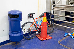 Als die Fähre entladen war, kam ein Mitarbeiter die Rampe runter und fragte mich, als er mich da sitzen sah, ob ich auf die Fähre wolle. Er hat mich dann gleich auf die Fähre gelassen, obwohl sie noch gar nicht mit dem Beladen angefangen hatten. Er meinte nur, dass es ja nicht nötig wäre, dass ich hier bei Wind und Regen weiter warten müsse. Also ich rauf auf die Fähre, Fahrrad verstaut (man beachte die Sicherung), hoch auf Deck gegangen und in der Cafeteria erst einmal eine Wurst, Cola und Kaffee bestellt. Das tat gut und war im Trockenen. Der Blick durch das Fenster in Richtung Als, also unserem Ziel, sah jedenfalls nicht gut aus.