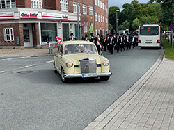 Am nächsten Morgen fuhr ich die ca. 2km vom Hotel zum Bahnhof. In der Bahnhofstraße war irgendeine Demo oder was auch immer, bei der ein alter Mercedes mit 4 Männern mit Zylindern auf dem Kopf voraus fuhr.