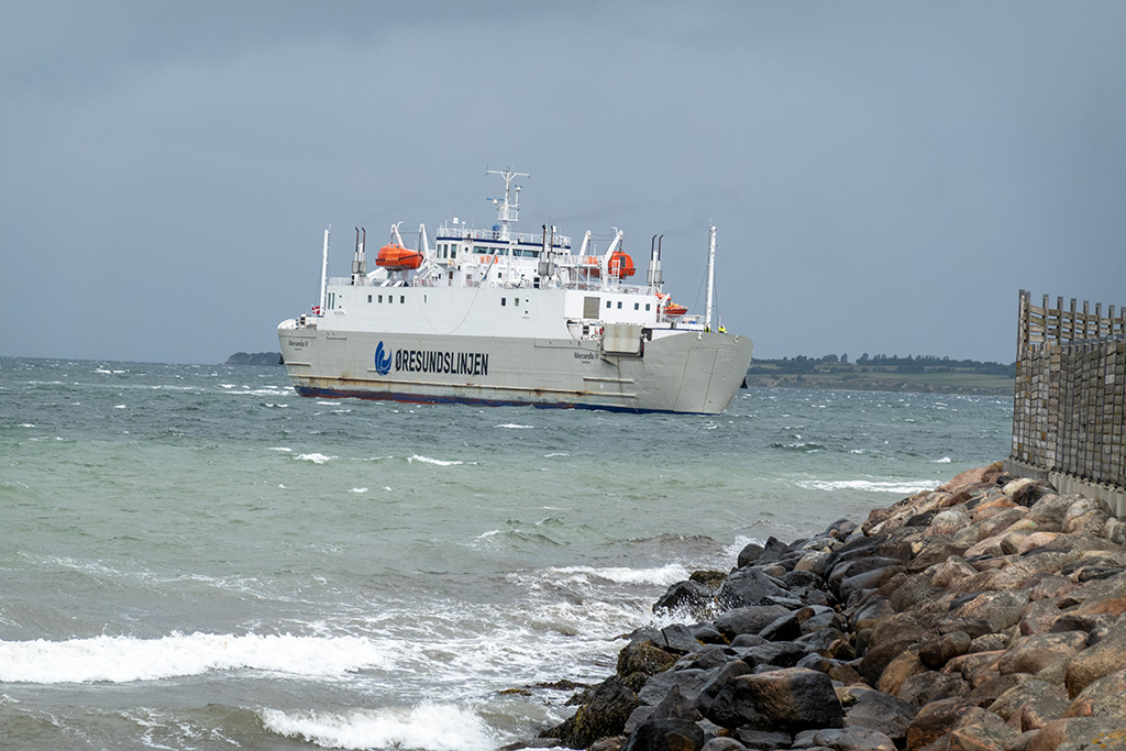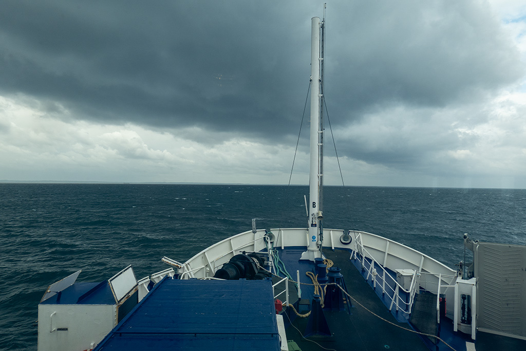 Nach kurzer Fahrt erreichte ich die Zufahrtstraße zum Fährhafen. So nah am Meer pfiff der Wind richtig und die Fahrt hinunter zum Meer war eher der Kategorie unangenehm zuzuordnen. Wobei die letzten 600-700m über den Damm waren die Hölle. Der Wind kam einfach ungeschützt direkt von vorne und dazu noch stark böig. Zudem begann es leicht zu regnen. Ich war froh, als ich endlich den Fährhafen erreicht hatte. Blöderweise war die Wartehalle wegen Renovierungsarbeiten gesperrt. Da ich aber schon um 9:20 Uhr hier ankam, ich meine Fähre aber erst um 13:00 Uhr gebucht hatte, musste ich versuchen umzubuchen. Am Fährhafen selbst war natürlich niemand und über die Gegensprechanlage war niemand erreichbar. Als ich dann eben eine neue Fahrkarte buchen wollte, ging es mit meiner Reservierungsnummer dann doch, auf die nächste Fähre umzubuchen.
