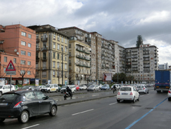 So fuhr ich bergab und erblickte bald das Meer, den Hafen und Salerno. Allerdings wurde die SS18 zum Autobahnzubinger und damit nicht zur besten Fahrradroute. Da diese Straße jedoch die einzige Alternative war nach Salerno zu kommen, begann ich das Abenteuer. Es ging zünftig bergauf und so war ich recht langsam unterwegs. Irgendwann stoppte ich kurz, was ich aber bald bereute. Ein Sattelschlepper ist mit ca. 30 cm Abstand vorbei gezogen. Für mich Grund genug, zu schauen, dass ich die Straße bald verlassen konnte.