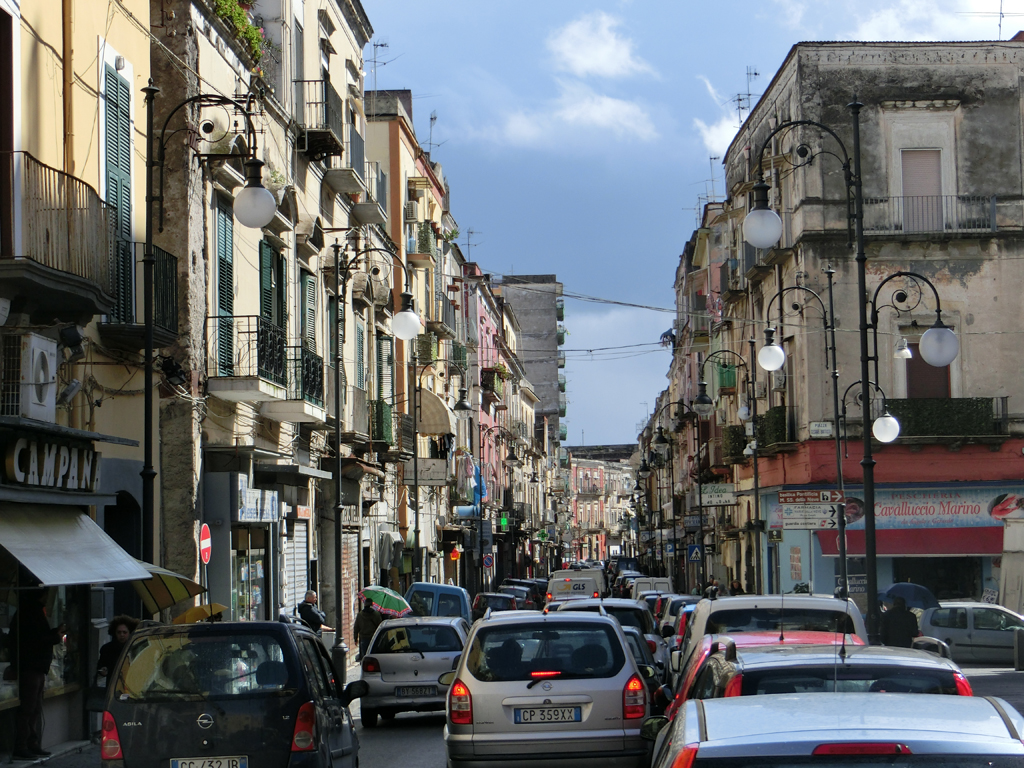 So gegen 9 Uhr kam ich dann endlich los und begab mich in das Abenteuer Stadtverkehr Neapel. Mitten durch den Stadtverkehr durch, mit Autos von allen Seiten und ohne jede Rücksicht. Zudem waren die Straßen nicht besser, als zum Hotel. Sobald ich die Hauptstraße am Meer verlassen hatte (sie war einfach zu Ende), durfte ich auf Kopfsteinpflaster fahren, teils nass, teils trocken. Und so kam ich deutlich langsamer voran, als gedacht. Aber bleibe dabei, die Italiener können kein Auto fahren. Mal rasen sie zu, dass alles zu spät ist, dann finden sie das Gaspedal wieder nicht oder sie fahren einfach drauf los.