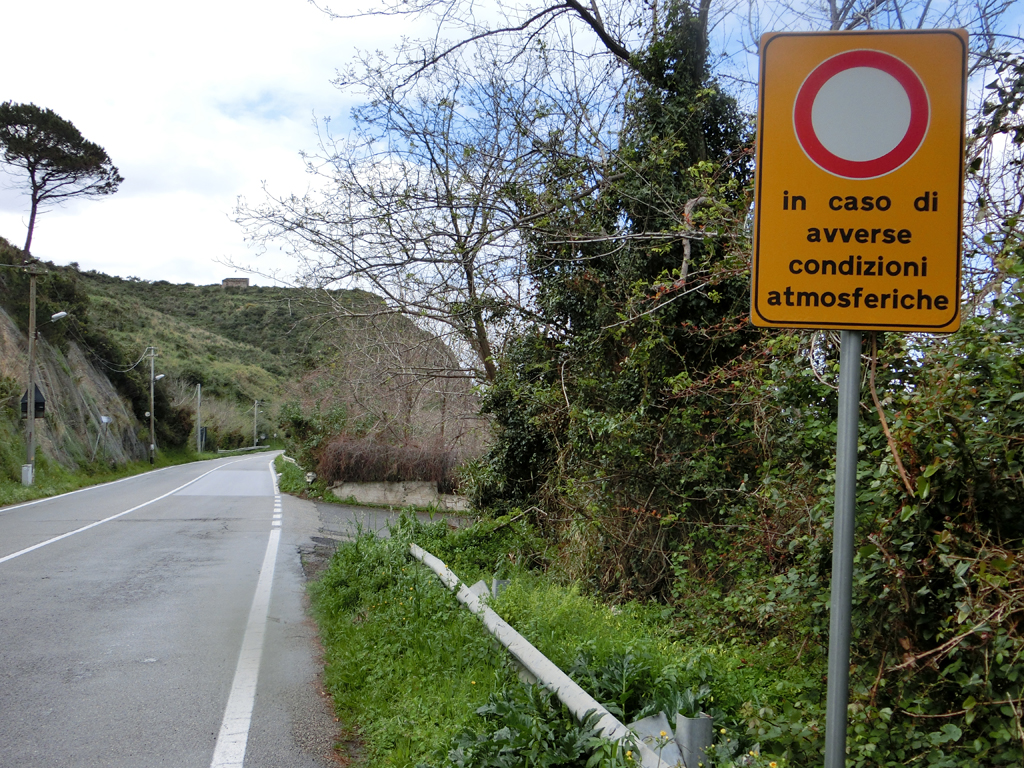 Kurz darauf sah ich wieder so ein Schild. Ich hatte ja nicht die besten Erinnerungen an gesperrte Straßen. Und lesen, was da stand, konnte ich auch nicht. Also fragte ich im nächsten Ort ein paar Passanten, ob die Straße offen sei. Sie war es, Glück gehabt. Im Nachhinein war mit auch klar, warum mich der alte Mann darauf hingewiesen hat, dass ich aufpassen soll, da die Straße bei Nässe glitschig ist und ich mit dem Rad wegrutschen könne. Klar, auf dem Schild steht ja auch "bei ungünstigen Witterungsverhältnissen"