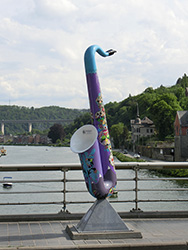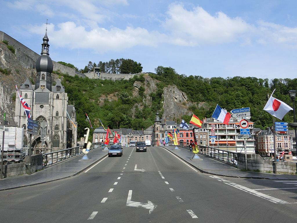 Nachdem die ganze Arbeit erledigt war, wollte ich mir den Ort, dessen Bild mich in einem Zeitungsartikel so fasziniert hatte, genauer anschauen. Also ging ich die Pont "Charles de Gaulle" wieder zurück. Dort standen überall bunte Saxophone in Übergröße rum. Das war mir bei der Überfahrt mit dem Fahrrad gar nicht so aufgefallen. Die Brücke wird auch "Die Brücke der Saxophone" genannt. Aber warum? Eine Recherche ergab, dass Adolphe Sax, der Erfinder des Saxophons, 1814 in Dinant geboren wurde. Man sagt nicht umsonst, dass reisen bildet...